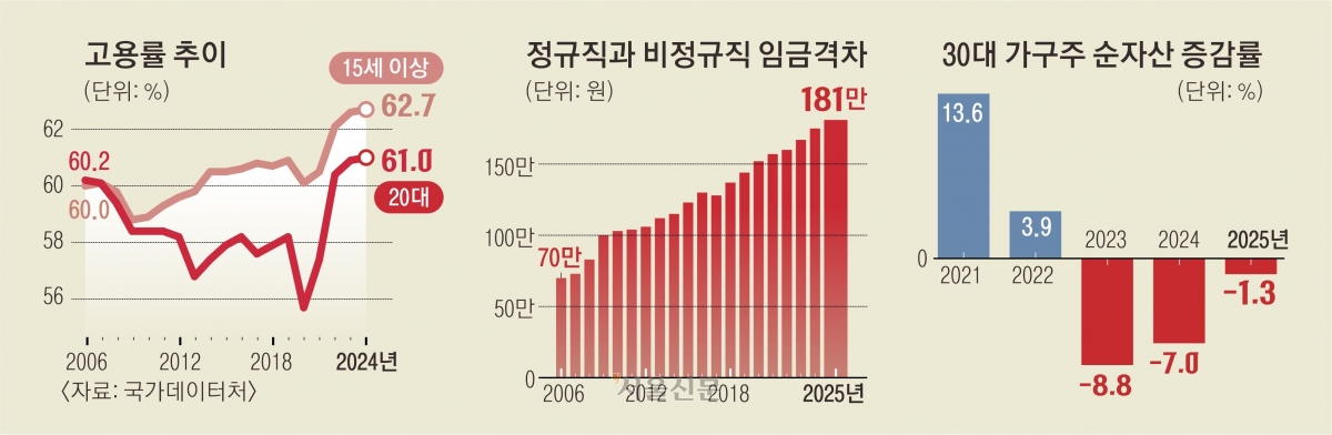 20대와 30대의 근로소득은 자산 형성의 기본이다. 기본이 튼튼하지 못하니 물가는 오르는데 자산이 줄기도 한다. 가계금융복지조사에 따르면 30대(가구주 연령 기준) 가구의 순자산은 2023년(-8.8%), 2024년(-7.0%), 2025년(-1.3%) 3년 연속 줄었다. 뿐만 아니라 연령별로 모든 세대에서 3년 연속 순자산이 줄기는 처음이다. 20대는 순자산 자체가 적은데도 종종 줄었다.