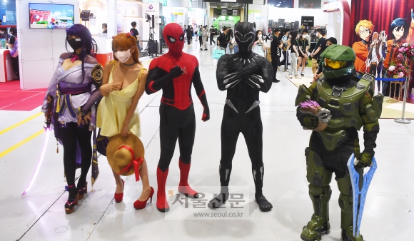 글로벌 문화 콘텐츠 축제인 ‘2022 서울 팝콘’이 25일 서울 강남구 코엑스에서 개막된 가운데 행사에 참여한 코스튬 플레이어들이 포즈를 취하고 있다. 서울 팝콘은 ‘서울 팝 컬처 컨벤션’을 줄인 말로 코믹스와 웹툰, 애니메이션, 캐릭터 등 글로벌 문화 콘텐츠 산업의 트렌드와 발전 방향 모색 및 새로운 패러다임을 제시하기 위해 마련됐다.